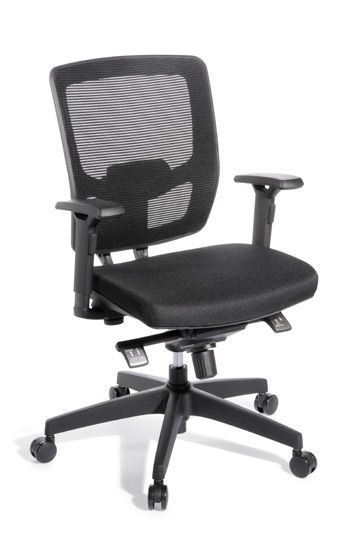 OFFICE CHAIR MEDIA ERGO MESH HIGHBACK. Smart, functional and supportive computer seating. With its supportive mesh backrest, generous sizing, and a smooth synchro mechanism, Media Ergo is suitable for all day use. Features a mesh high back rest and a well balanced synchro mechanism for tension adjustment. Synchro mechanism: dynamic back-with-seat tilt movement. Gaslift height adjustment. Height adjustable lumbar. Adjustable armrests (removable). Standard black fabric seat with black mesh back. Seat size: 510mm wide x 480mm deep. Back height: 500mm Indicative sitting hours per day: 8. Indicative maximum user weight rating: 140kg. 5 year warranty in normal office use - excludes fabric. Supplied assembled. Shipped from supplier. Online only item, no returns.