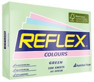 COLOURED PAPER REFLEX GREEN A4 80GSM REAM/500 . Stand out with Reflex Colours! Use Reflex green paper to highlight your work and brighten up your workplace for impact and efficiency. Ideal Sold for flyers, leaflets, presentations, reports, training documents, certificates, statements, invoices, notices, newsletters and direct mail. Guaranteed for all printers and copiers. Reflex Colours are acid free and meet the Australian Forestry Standard (AS 4707). Certified by the international Forest Stewardship Council (FSC). Sold in reams, packed in cartons of 5 reams.