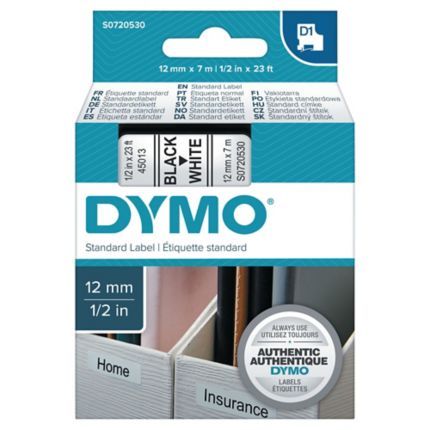 LABELLING TAPE BLACK ON WHITE D1 12MMX7M DYMO 45013. Created specifically for the Dymo LabelManager label makers. Features split-backing tape so they are easy to peel and apply. Adheres to almost all clean flat surfaces (including plastic, paper, metal, wood and glass). Labels can be removed without leaving adhesive residue. Temperature resistant - withstands temperatures from -40 to +90 degrees celsius. Water resistant - withstands water, oils, greases and most milder solvents. UV resistant - withstands exposure to sunlight without fading or peeling. Suitable for Dymo 500, 1000, 1000+, 2000, 3500, 5000, 5500, LabelManager 100+/150/200/300/350/400/PC and LabelPoint 200/300. OEM S0720530