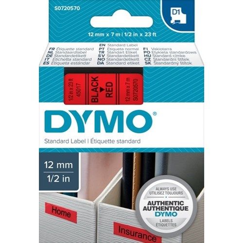 LABELLING TAPE BLACK ON RED D1 12MMX7M DYMO. Created specifically for the Dymo LabelManager label makers. Features split-backing tape so they are easy to peel and apply. Adheres to almost all clean flat surfaces (including plastic, paper, metal, wood and glass). Labels can be removed without leaving adhesive residue. Temperature resistant - withstands temperatures from -40 to +90 degrees celsius. Water resistant - withstands water, oils, greases and most milder solvents. UV resistant - withstands exposure to sunlight without fading or peeling. Suitable for Dymo 500, 1000, 1000+, 2000, 3500, 5000, 5500, LabelManager 100+/150/200/300/350/400/PC and LabelPoint 200/300. OEM S0720570