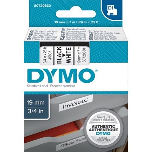LABELLING TAPE BLACK ON WHITE D1 19MMX7M DYMO. Created specifically for the Dymo LabelManager label makers. Features split-backing tape so they are easy to peel and apply. Adheres to almost all clean flat surfaces (including plastic, paper, metal, wood and glass). Labels can be removed without leaving adhesive residue. Temperature resistant - withstands temperatures from -40 to +90 degrees celsius. Water resistant - withstands water, oils, greases and most milder solvents. UV resistant - withstands exposure to sunlight without fading or peeling. Suitable for Dymo 500, 1000, 1000+, 2000, 3500, 5000, 5500, LabelManager 100+/150/200/300/350/400/PC and LabelPoint 200/300. OEM S0720830