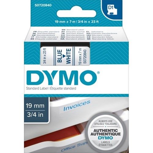 LABELLING TAPE BLUE ON WHITE D1 19MMX7M DYMO. Created specifically for the Dymo LabelManager label makers. Features split-backing tape so they are easy to peel and apply. Adheres to almost all clean flat surfaces (including plastic, paper, metal, wood and glass). Labels can be removed without leaving adhesive residue. Temperature resistant - withstands temperatures from -40 to +90 degrees celsius. Water resistant - withstands water, oils, greases and most milder solvents. UV resistant - withstands exposure to sunlight without fading or peeling. Suitable for Dymo 500, 1000, 1000+, 2000, 3500, 5000, 5500, LabelManager 100+/150/200/300/350/400/PC and LabelPoint 200/300. OEM S0720840
