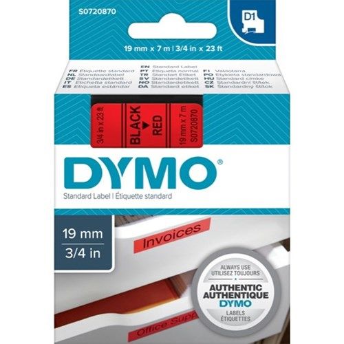 LABELLING TAPE BLACK ON RED D1 19MMX7M DYMO. Created specifically for the Dymo LabelManager label makers. Features split-backing tape so they are easy to peel and apply. Adheres to almost all clean flat surfaces (including plastic, paper, metal, wood and glass). Labels can be removed without leaving adhesive residue. Temperature resistant - withstands temperatures from -40 to +90 degrees celsius. Water resistant - withstands water, oils, greases and most milder solvents. UV resistant - withstands exposure to sunlight without fading or peeling. Suitable for Dymo 500, 1000, 1000+, 2000, 3500, 5000, 5500, LabelManager 100+/150/200/300/350/400/PC and LabelPoint 200/300. OEM S0720870.