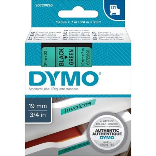 LABELLING TAPE BLACK ON GREEN D1 19MMX7M DYMO. Created specifically for the Dymo LabelManager label makers. Features split-backing tape so they are easy to peel and apply. Adheres to almost all clean flat surfaces (including plastic, paper, metal, wood and glass). Labels can be removed without leaving adhesive residue. Temperature resistant - withstands temperatures from -40 to +90 degrees celsius. Water resistant - withstands water, oils, greases and most milder solvents. UV resistant - withstands exposure to sunlight without fading or peeling. Suitable for Dymo 500, 1000, 1000+, 2000, 3500, 5000, 5500, LabelManager 100+/150/200/300/350/400/PC and LabelPoint 200/300. OEM S0720890.