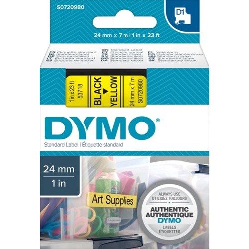 LABELLING TAPE BLACK ON YELLOW D1 24MMX7M DYMO. Created specifically for the Dymo LabelManager label makers. Features split-backing tape so they are easy to peel and apply. Adheres to almost all clean flat surfaces (including plastic, paper, metal, wood and glass). Labels can be removed without leaving adhesive residue. Temperature resistant - withstands temperatures from -40 to +90 degrees celsius. Water resistant - withstands water, oils, greases and most milder solvents. UV resistant - withstands exposure to sunlight without fading or peeling. Suitable for Dymo 500, 1000, 1000+, 2000, 3500, 5000, 5500, LabelManager 100+/150/200/300/350/400/PC and LabelPoint 200/300. OEM S0720980.