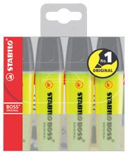 HIGHLIGHTER STABILO BOSS YELLOW PKT/4. Market leader in highlighting, the Stabilo Boss is the only highlighter available in 9 fluorescent colours. 4 hour cap-off time. Chisel tip for 2 line widths: 2 and 5mm. Water based ink for paper, copy or fax.