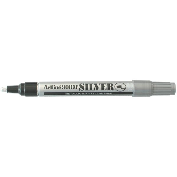 ARTLINE 900 METALLIC SILVER MARKER MEDIUM 2.3MM. Fade proof metallic ink. Ink is heavily pigmented so it can be seen on dark surfaces. Permanent on most surfaces. Can withstand up to 100C. Bullet nib with a 2.3mm line width. Valve action for controlled ink flow. Fast drying.