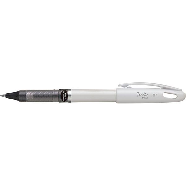 PENTEL ENERGEL PEN TRADIO MED BLACK/WHT GEL INK WHITE BARREL. New stylish Tradio Energel rollerpen. Unique chic design from France. Energel is the latest development in gel ink technology with its revolutionary quick drying ink. No-smudge formula. 0.7mm nib. Refillable using LR7-A black refill. Sold singly and in packs of 12.