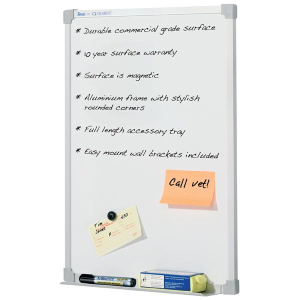 PREMIUM MAGNETIC WHITEBOARD 450 X 600MM PENRITE QTPWP0456. Slimline magnetic whiteboard with an aluminium frame. Features a 10 year surface warranty. The commercial grade surface erases cleanly and resists ghosting over time. Will remain pristine with only occasional maintenance. Slim aluminium frame edges for a sleek, modern finish. Includes pen tray and wall mounting kit. Best suited for moderate use in spaces with regular traffic. Includes pen tray and wall mounting kit.