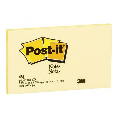 POST IT NOTES 655 CANARY YELLOW 73X123MM. Self stick non-marking repositionable notes, low tack adhesive allows sticking to most surfaces. 100 sheets per pad. Individually wrapped. Sold in singles. Order x 12 for a pack.