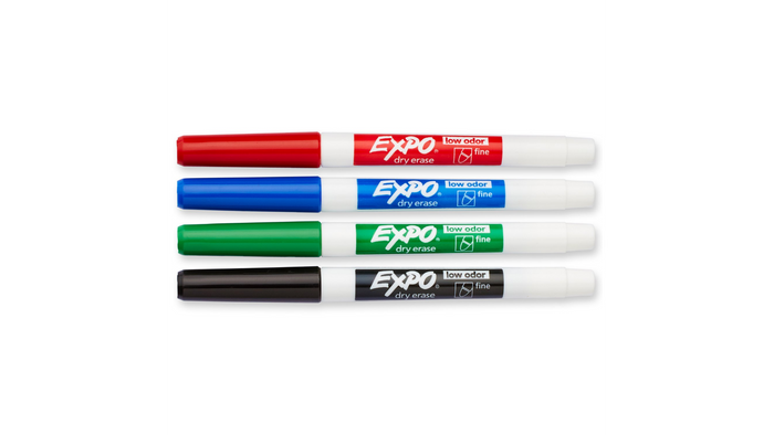 WHITEBOARD MARKER EXPO ASSORTED COLOURS FINE TIP PKT/4 . Dry erase markers in a range of bold, vibrant colors. Fine tip perfect for accurate, detailed lines. Low odor ink, ideal for home, classroom, and office use. Erase cleanly and easily with an EXPO eraser. Includes: 4 dry erase markers in assorted colors.