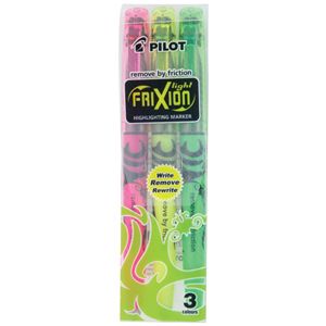 PILOT HIGHLIGHTERS FRIXION ASSORTED PK3 . Write - Remove - Rewrite! The Frixion Light adds the convenience of a highlighter to the Frixion range of unique erasable pens. Thermo sensitive ink disappears with friction using rubber tail plug on the pen, with no debris. Stick in the freezer at -20°C and your scribbling will reappear. A unique, patented erasable pen that really works. Pack of three colours - Pink, Yellow and Green.