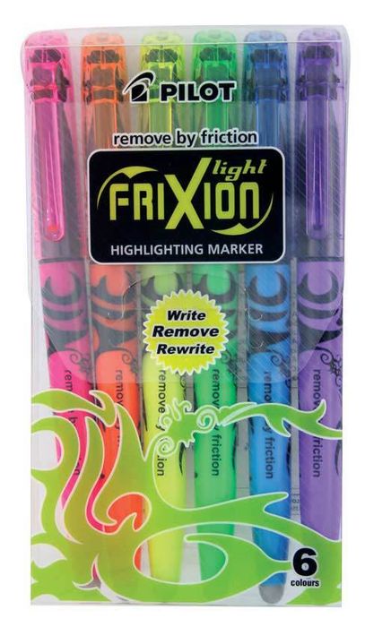 PILOT HIGHLIGHTERS FRIXION ASSORTED PK6. Write - Remove - Rewrite! The Frixion Light adds the convenience of a highlighter to the Frixion range of unique erasable pens. Thermo sensitive ink disappears with friction using rubber tail plug on the pen, with no debris. Stick in the freezer at -20°C and your scribbling will reappear. A unique, patented erasable pen that really works. Pack of 6 - Pink, Orange, Yellow, Green, Blue and Violet.