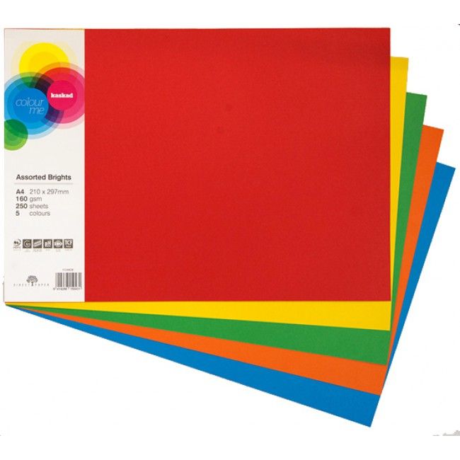 COLOURED CARD ASSORTED BRIGHT A4 160GSM REAM/250 SHEETS KASKAD . An extensive range of beautiful coloured paper suitable for direct mail, advertising material, brochures, posters, invitations, covers. Available in A4, the 80gsm carries a guarantee for mono desktop laser machines and the 160gsm is recommended compatible. Certified by the Australian Forestry Standard (AS 4707) which is globally recognised by the Programme for the Endorsement of Forest Certification (PEFC). Quality and performance tested, exceptional smoothness.
