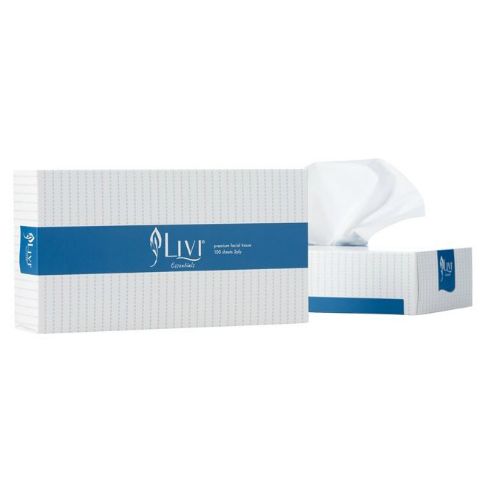 LIVI FACIAL TISSUE BOX/100. Premium white 2 ply facial tissue. Produced from the highest quality materials. PEFC Certified. Soft tissues that are made from virgin pulp. 100 sheets per box. Ideal for having on your office desk, in the car or in smaller spaces. These tissues are hypoallergenic, making them gentle on skin and suitable for sensitive skin. 30 boxes per carton.