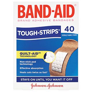 BAND AID TOUGH STRIPS FABRIC PKT/40. Inside every Waterproof Tough-strips bandaid plaster you'll find these technologies: Quilt-Aid technology: Non-stick pad technology. A unique quilted pad which draws fluid away from the wound. Waterproof: 100% waterproof. Shields out water, dirt and germs. Super Stick: Stays on until you want it off. Band-Aid brand adhesive bandages help cuts heal twice as fast as uncovered cuts.