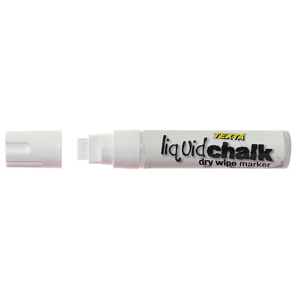 TEXTA JUMBO LIQUID CHALK DRY WIPE WHITE . For decorating or writing on glass, windows and virtually all non-porous surfaces. Permanent on cloth, leather, paper and other porous surfaces. Dry wipe erase on glossy surfaces.Chisel nib size H7 x W15mm.
