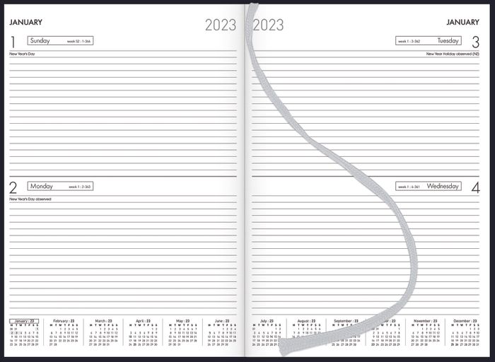 COLLINS DIARY A42 BLACK ODD YEAR L297 X W210MM. A4 portrait, 2 days per page. Ribbon marker. Sewn, hard book, cloth cover.
