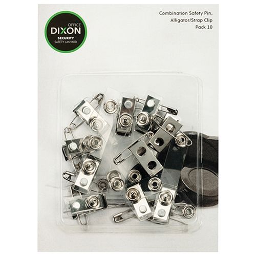 DIXON ID PIN CLIP STRAP PACK PKT/10. Combination ID alligator strap and pin. Extremely versatile. Easily attached to and removed from clothing. Made from metal and plastic. Durable and environmentally friendly. Pack of 10.