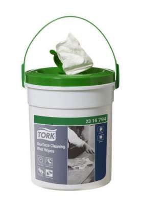 TORK SURFACE CLEANING WET WIPES TUB/72. No water? No worries - with Tork Surface Cleaning Wet Wipes you can clean dirty hands and surfaces quickly and easily, wherever you are. Pre-moistened, thick & durable disposable wipes in a convenient, portable bucket for hand cleaning.