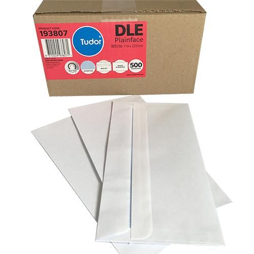 TUDOR ENVELOPES DLE PLAIN WHITE S/S 500. The most popular size business envelope. Designed to take A4 paper folded in three. Size 114mmL x 225mmW, wallet - open on the long side, white, plain envelopes. Self seal. Box of 500.