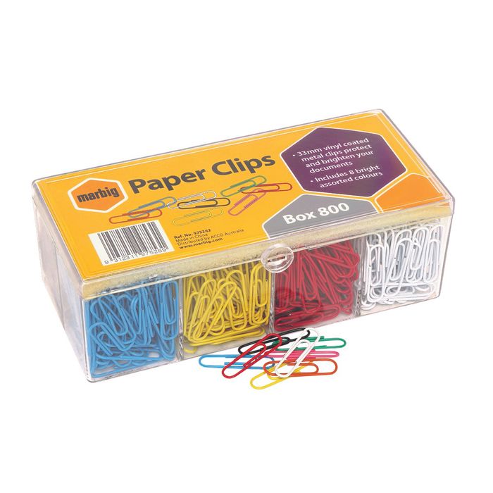 MARBIG PAPER CLIPS COLOURED 33MM BX/800. 33mm vinyl coated round metal clips. Clips protect paper and photos from scratches. Strong, sturdy wire construction grips papers firmly. The box includes 8 bright colours: Green, Red, Pink, Yellow, White, Blue, Black and Orange. In sturdy plastic reusable container with compartments for each colour.