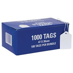 HARDWARE TAGS 26H 47X30MM BUNDLE/100. White cardboard construction with string. Sold in bundles of 100. There are 10 bundles in a box.