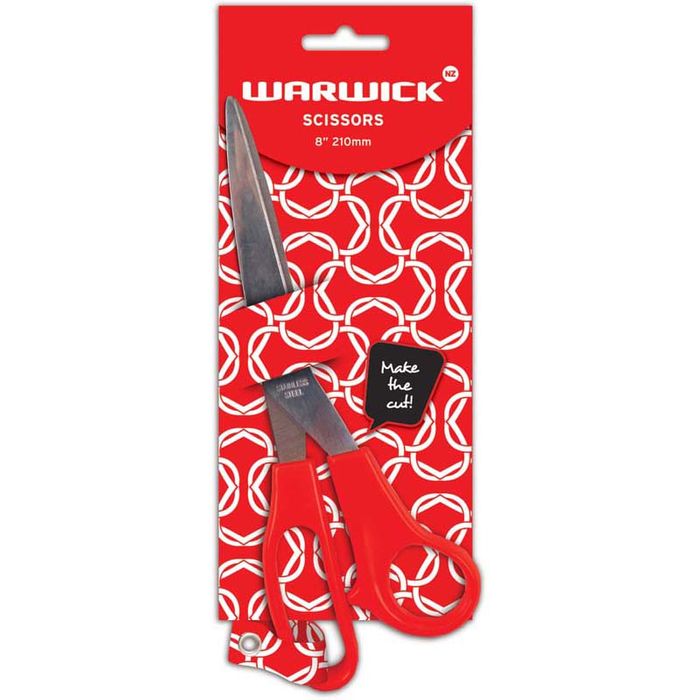 Warwick Scissors 8 Inch 210mm General Purpose. Warwick office scissors with 210mm stainless steel blade. Featuring a red plastic handle.