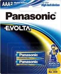 PANASONIC BATTERY EVOLTA AAA PKT2. Panasonic EVOLTA long-lasting batteries deliver exceptional performance in low, mid and high drain products, plus they are so energy-efficient you will save resources by using fewer batteries.