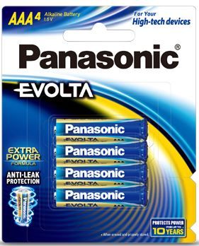 PANASONIC BATTERY EVOLTA AAA PKT4 . Panasonic EVOLTA long-lasting batteries deliver exceptional performance in low, mid and high drain products, plus they are so energy-efficient you will save resources by using fewer batteries.