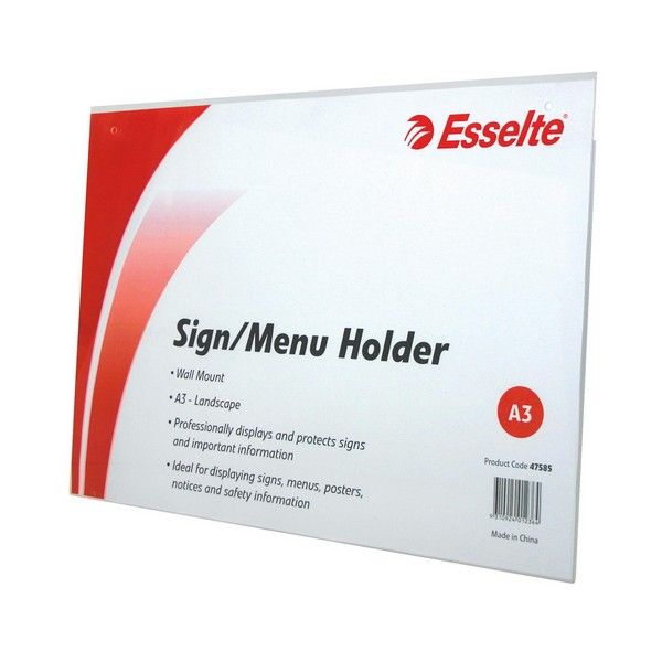 MENU/SIGN HOLDER ESSELTE A3 LANDSCAPE WM WALL MOUNT CLEAR. Ideal for showcasing menus, photographs, information signs and brochures. High Quality one piece display units for all your presentation needs. 1.5mm thick.