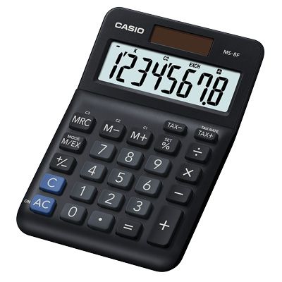 DESKTOP CALCULATOR CASIO MS-8F BLACK. 8 digit display, dual-powered, profit margin % key, +/- key, tax function, independent memory. The dimensions are W103mm x D147mm x H28.8mm. 1 year warranty.