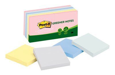 POST-IT GREENER NOTES 654-RP HELSINKI PKT/12. Post-it Greener Notes in 76mm x 76mmm size are made from 100% recycled paper and a plant-based adhesive - which means no new trees were used. The plant material used to make the adhesive was replenished after harvesting. A World of Colour Helsinki Collection brings airy and clean colours that honor the simple pleasures of Scandinavian living. 12 Pads of 100 sheets per pack.