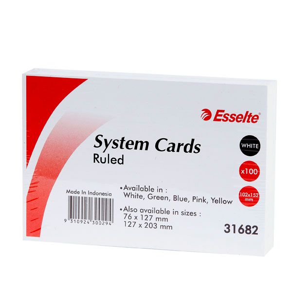 ESSELTE SYSTEM CARDS WHITE 6X4IN PK100 52x102MM. 200 gsm quality board. Ruled on the front and back of the system card. Feint colours ensure your text can easily be read. Perfect system cards to compliment the Esselte Card File boxes and Index Cards.