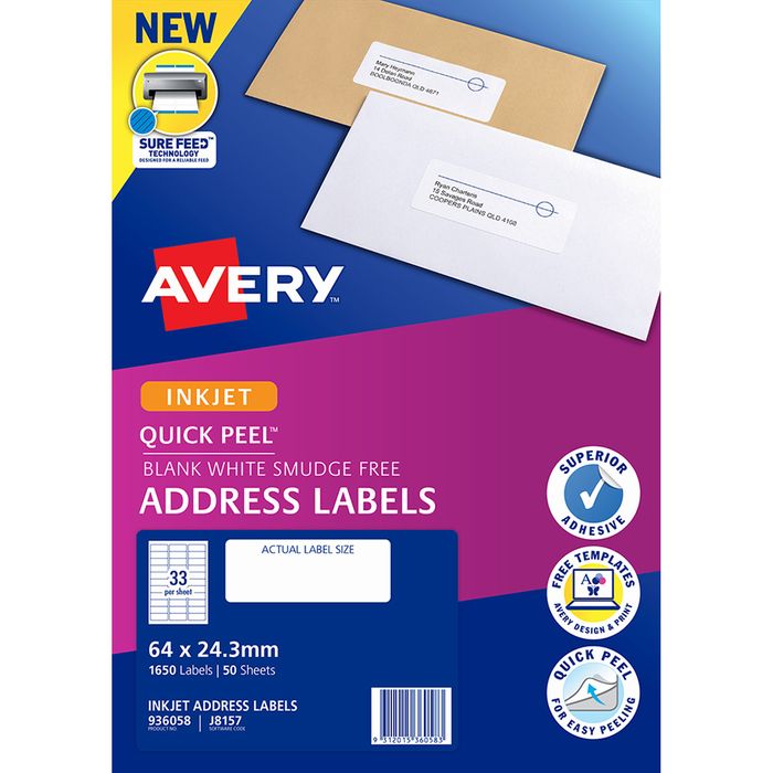 AVERY INKJET LABELS J8157 33UP PKT/50. Avery Product Number: 936058. Quick Peel Pop-up Edge Colour: White Recommended for addressing DL envelopes. 64 x 24.3 mm. Permanent adhesive. 33 labels per page . 50 sheets per pack. 1650 labels per pack.