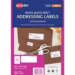AVERY INKJET LABELS J8158 30UP PKT/50. Avery Product Number: 936056. Quick Peel Pop-up Edge Colour: White Recommended for addressing DL envelopes. 64 x 26.7 mm. Permanent adhesive. 30 labels per page . 50 sheets per pack. 1500 labels per pack.