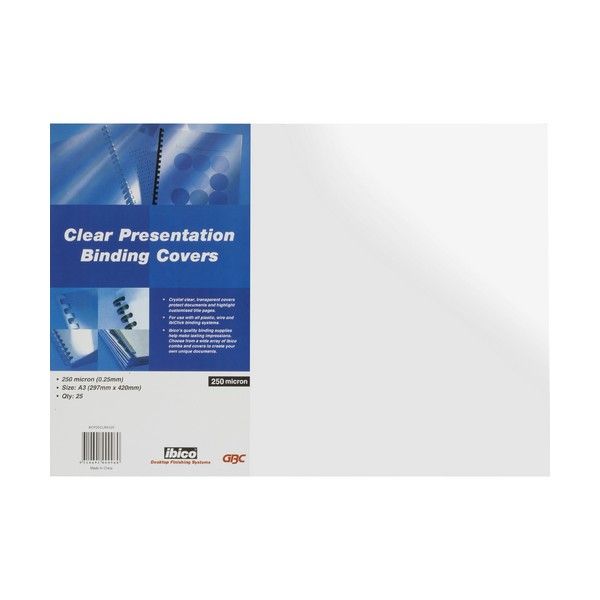 COVERS CLEAR IBICO A3 250 MICRON PKT/25. Create professional documents in minutes with Ibico binding products and accessories. A3 clear covers are available in a variety of thicknesses. Keeps bound documents clean and protected. 250micron.