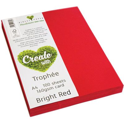 TROPHEE CARD A4 BRIGHT RED 210GM 100P. Ideal for inkjet printers & laser printers/copiers Weight: 210gsm. Colour: Bright fluoro red colour. Pack of 100 sheets.