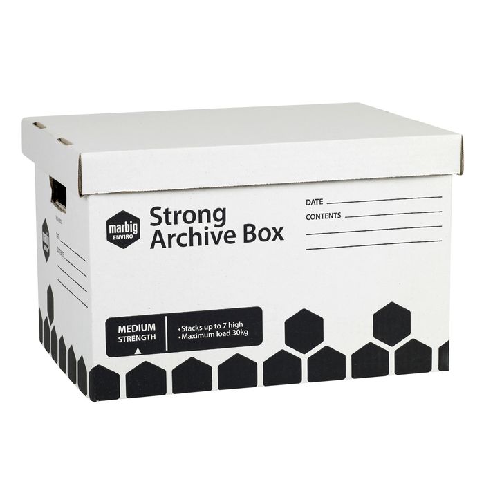 MARBIG STRONG ARCHIVE BOX. The Marbig archive box range is perfect for all your archiving needs. Available in a variety of sizes, strengths and colours, the marbig archive boxes are the ideal way to store all your important documents. Max load 30kg. Strong burst resistant base for regular access and transportation of a mid-weight load. Holds foolscap suspension files/manilla folders, or up to 3 lever arch files, or 6 ring binders. Label, track and find all of your archive boxes with the free online Marbig archive box management. Outside dimensions: 420L x 320W x 260mm. Australian made using FSC certified board.