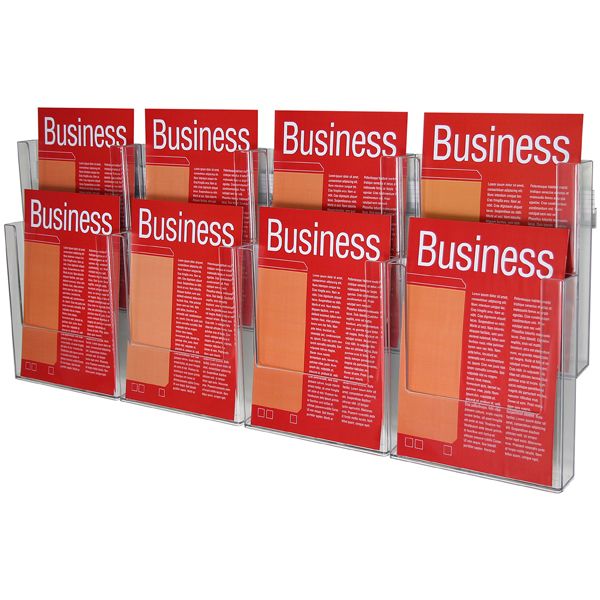 BROCHURE HOLDER ESSELTE WALL SYS A4 2T-8 2-TIER 8 COMPARTMENTS CLEAR . Easy to assemble and are ideal for showcasing product flyers, brochures and other important information. All wall systems come with easy to follow assembly instructions and include the following components; polycarbonate strips, wall mounting strips used to affix to any wall surface, hanging clips to link the brochure holders together, support brackets for additional structural support. DL dividers are also available as an accessory to convert the A4 wall systems holders into DL compartments.