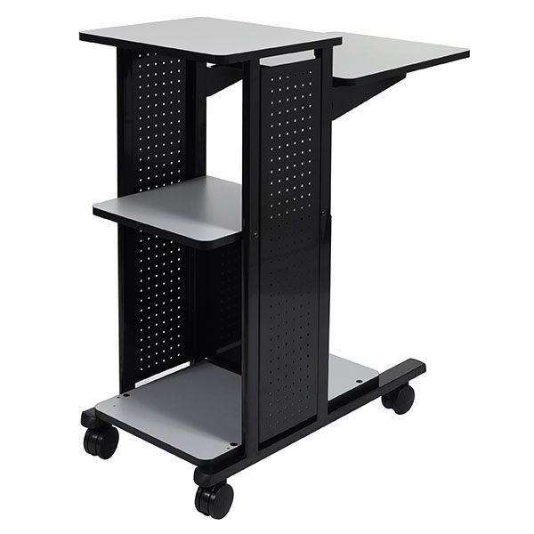 MULTIMEDIA PRESENTATION STATION TROLLEY TUFFY . This unique unit holds everything that is needed during a presentation. Versatile and mobile, the 4 work surfaces have adjustable platforms and shelves making it perfect for use with laptops and multimedia projectors as well as a writing platform and lectern, the second platform can be raised to the top platform or lowered in 10cm increments. Platforms are grey laminate and the sides are steel with a black finish, weight - 27.6kg, forward specifications - L450 x W393mm, rear specifications - L450 x W450mm, fixed specifications - L375 x W375mm, bottom specifications - L412 x W762mm, total dimension are L460 x W900 x H975mm. 1 Year Warranty.