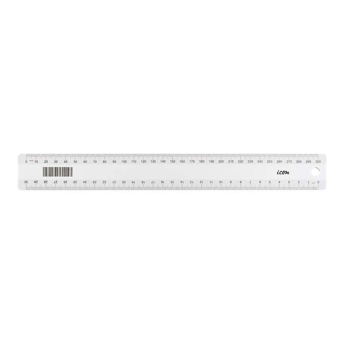 ICON RULER CLEAR 30CM. Icon 30cm plastic rulers are perfect for use at school, home or in the office to rule those straight lines. They feature bevelled edges for clean, straight lines and graduations are in millimetres and centimetres. Measurements are on both edges, millimetres on one edge and centimetres on the other. 30cm length. Clear colour.