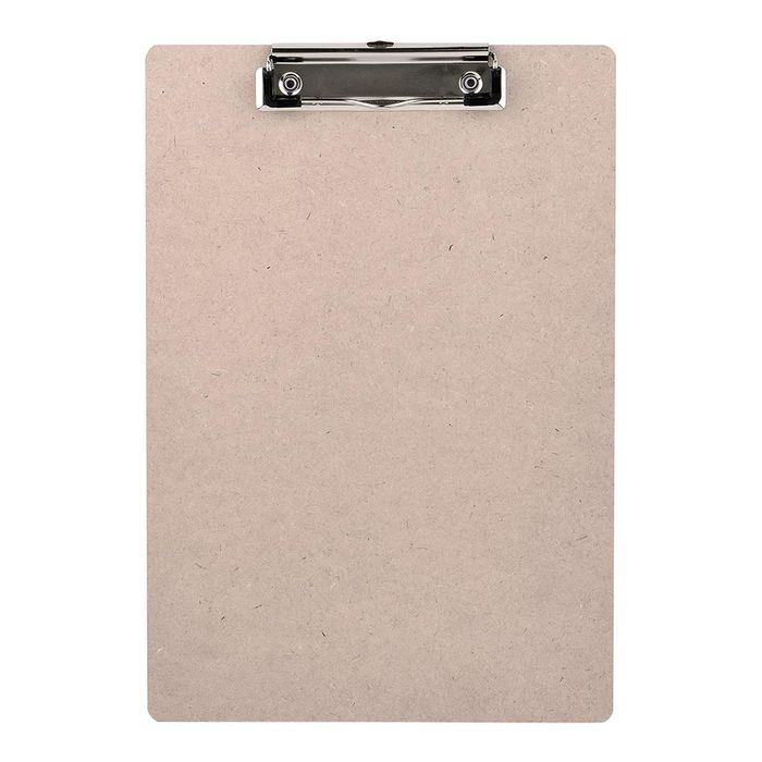 OSC CLIPBOARD HARDBOARD A4. Office Supply Co hardboard clipboard, with a flat metal clip. Strong and durable design with solid writing surface. Features a hole on the clip to hang clipboard on a wall. Light brown board. A4 size.