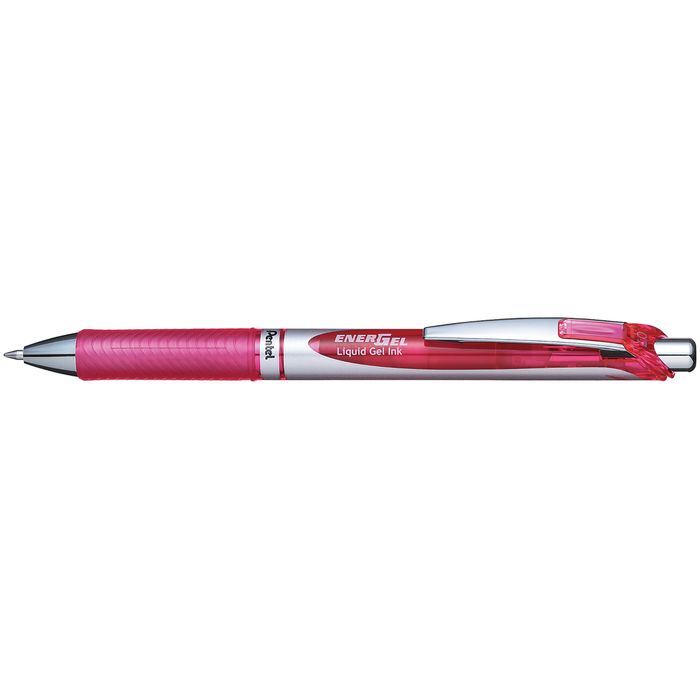 PEN ENERGEL GEL ROLLER BL77 0.7MM PINK RETRACTABLE. The next generation of Pentel gel roller pen has been engineered to incorporate the best qualities of liquid ink, producing ultra smooth , quick drying liquid gel ink. Retractable. Sleek and stylish design clip and silver barrel. Comfortable rubber grip. 0.7mm line width. Environmentally friendly - made from 54% recycled materials. Refillable with LR7-A refill. Sold singly and in packs of 12.