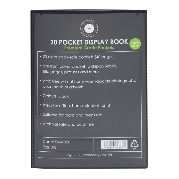 OSC Insert Display Book A3 20 Pocket Black. Office Supply Co Display book with insert front cover. Clear plastic polypropylene pages keep your paper and documents securely protected. Pockets are securely bound into the the spine of the durable polypropylene cover. Black colour. A3 size. 20 pockets. 40 page capacity.