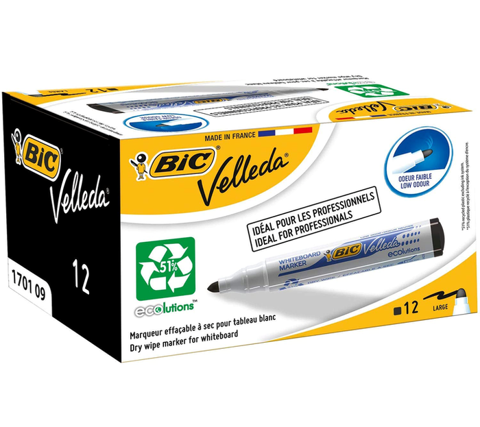 BIC VELLEDA WHITEBOARD MARKER BULLET TIP BLACK. BIC VELLEDA ECOLUTIONS IS DRY WIPE MARKER FOR WHITEBOARD IS LOW IN ODOUR. *51% RECYCLED PLASTIC EXCLUDING THE INKSYSTEM. LARGE BULLET TIP. IDEAL FOR OFFICE OR CLASSROOM. STORE HORIZONTALLY.