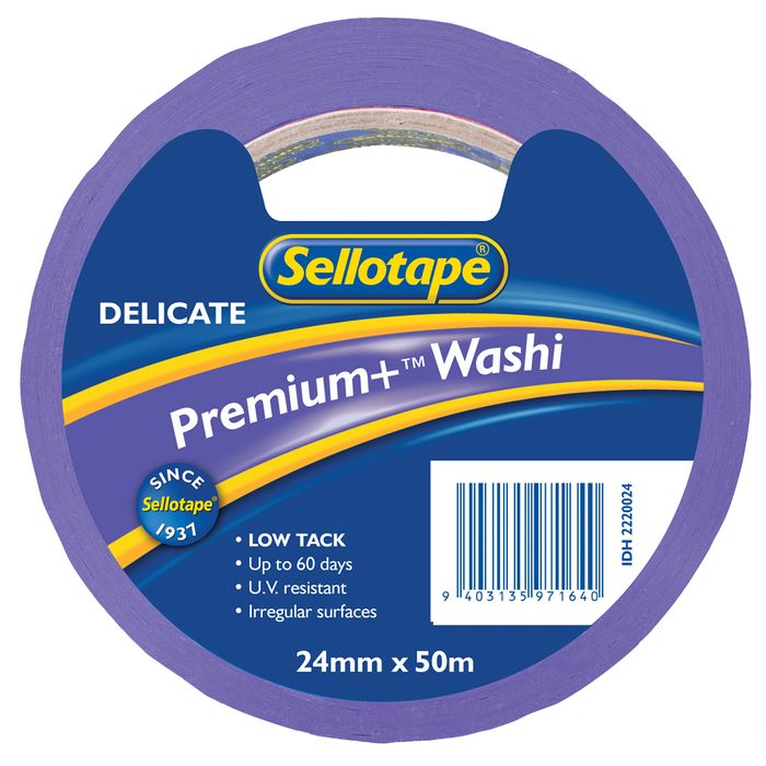 Sellotape Washi Premium+ Delicate 24mm x 50m. Sellotape Washi Premium+ Delicate Masking Tape is a purple, washi (rice paper) film with an acrylic adhesive, designed for a wide range of general-purpose masking applications. Premium+ Delicate is particularly suitable for applications where good conformability to rough surfaces is required due to a slightly thinner film. Premium+ Delicate is lower tack which makes is especially suited to use on freshly painted / treated surfaces. Washi tapes remove cleanly without leaving residue or causing damage on most surfaces. Note: Remove within 60 days. Remove when paint is touch dry. Test in an inconspicuous place before use.