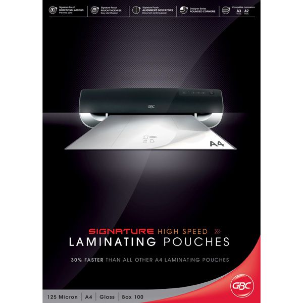 LAMINATING POUCHES GBC A4 H/SPEED PK100 125 MICRON IBICO HIGH SPEED. GBC laminating pouches provide superior document protection. Featuring the highest quality materials GBC pouches are crystal clear with a high gloss finish. GBC pouches come standard with rounded corners and are available in a variety of thicknesses,sizes. High Speed pouches are sealed on the long side. (Standard pouches are sealed on short side) 30% faster than all other A4 laminating pouches . Please note: only for use in A4 & A3 laminators. Also features signature pouch technology - Premium laminating pouches that feature embedded instructions. Includes directional arrows, pouch thickness and guidelines. All instructions vanish on use.