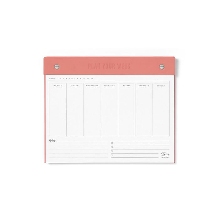 Letts Undated Weekly Planner 250x200mm Conscious Clay. 60 tear-off sheets of 80gsm recycled white paper. Backing made with recycled polyester. Printed with soy ink. Constructed using vegan glue.Dimensions: 250 x 200mm.