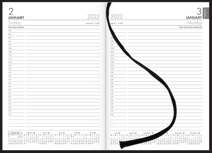 COLLINS DIARY A51A BLACK EVEN YEAR APPOINTMENT. A5 portrait. 1 day per page, 1/2 hour appointments 7.30am-7.30pm. Cash summary. Ribbon marker. Sewn, hardcover, book cloth cover.